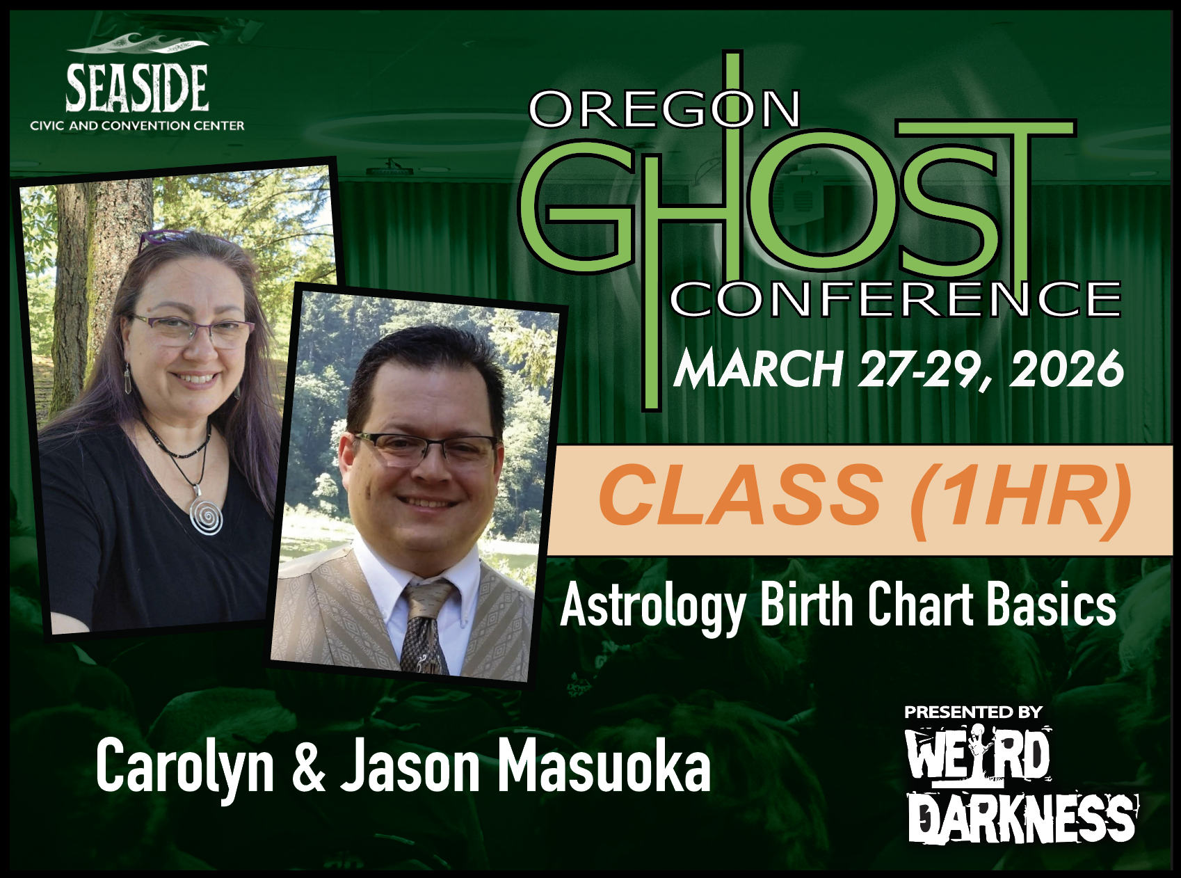 General Admission Tickets are $20 and are good for the entire weekend. General Admission Tickets can be purchased through our Online Box Office or at the Oregon Ghost Conference Box Office at the Seaside Civic and Convention Center: Friday, March 27th-Sunday, March 29th.