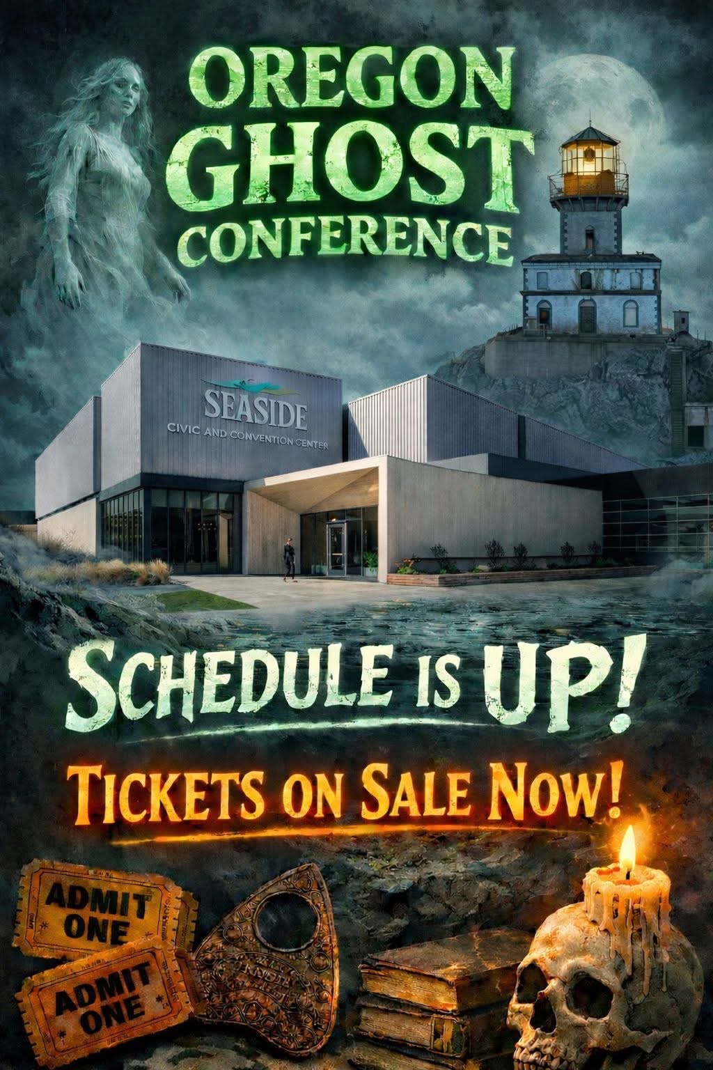 | Before purchasing tickets for Classes, Evening Events, Investigtions or Ghost Tours, we highly recommend that you make a plan by looking at the 2026 Schedule so you can decide how you want to spend your time and to make sure you don’t purchase tickets for classes or events that overlap or cause scheduling conflicts. Please plan carefully because there are NO CASH REFUNDS. Individual tickets for classes, tours, investigations and events are available from each class or event page and can also be found through the 2026 Schedule or the Online Box Office. In addition to purchasing individual tickets to classes, tours or events, you will also need to purchase a General Admission Ticket. General Admission Tickets are $20 and are good for the entire weekend. General Admission Tickets can be purchased through our Online Box Office or at the Oregon Ghost Conference Box Office at the Seaside Civic and Convention Center: Friday, March 27th-Sunday, March 29th. General Admission tickets are good for admission to the Vendors Area and all Main Stage Speaker presentations for all three days of the Oregon Ghost Conference. Sunday Only General Admission Tickets are $10 and can only be purchased in person at the Oregon Ghost Conference Box Office at the Seaside Civic and Convention Center, Sunday, March 29th ONLY. |