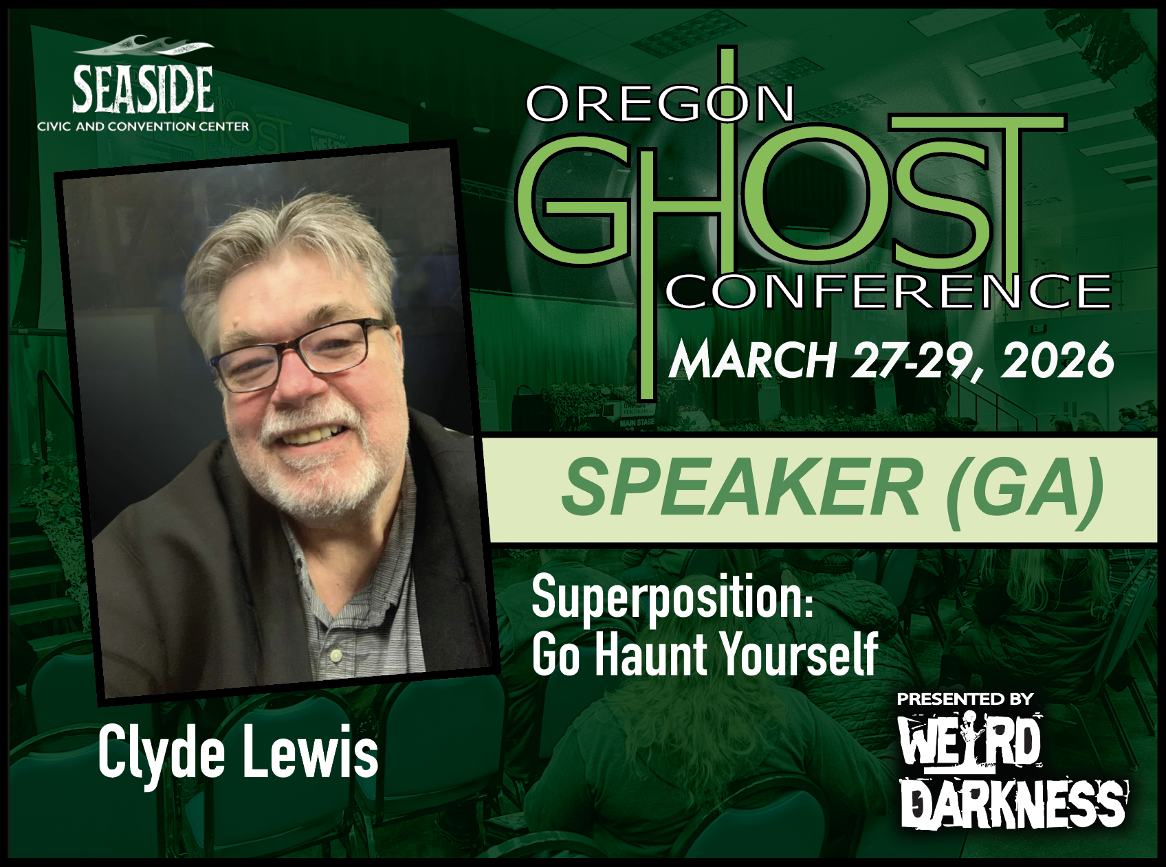General Admission Tickets are $20 and are good for the entire weekend. General Admission Tickets can be purchased through our Online Box Office or at the Oregon Ghost Conference Box Office at the Seaside Civic and Convention Center: Friday, March 27th-Sunday, March 29th.