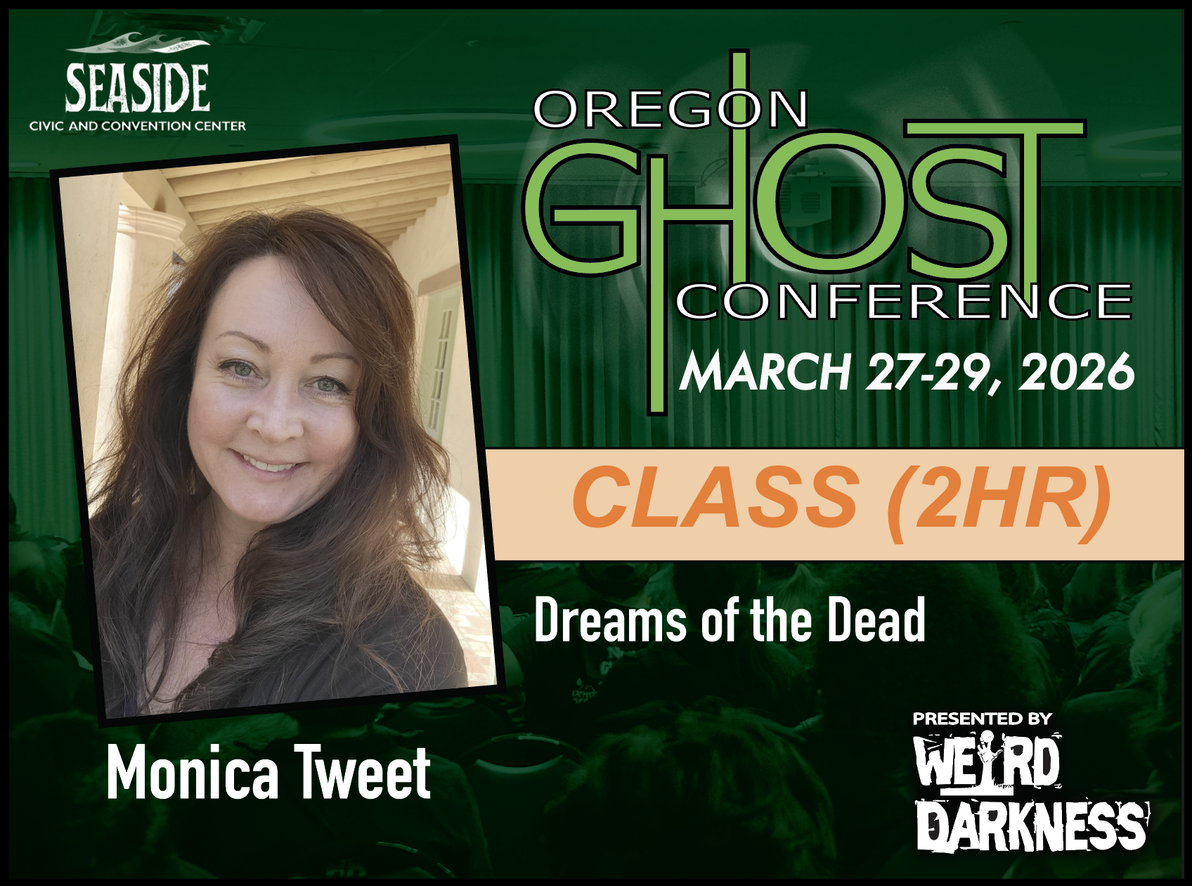 | | | | | | | | This class includes lecture and experiential activities designed to assist participants with developing their innate, extraphysical abilities of body and psyche in order to safely and effectively engage with dream images and spirit communicators. After learning some basic dream tending skills, we will journey into active imagination and invite the innate intelligence of autonomous dream images and landscapes to come forward and join us in the here and now. This journey into active imagination allows one to open their consciousness to the borderlands of psyche, soul, and spirit. By engaging with dream images, participants will learn somatic-psychic attunement skills and how to develop a witnessing presence. These skills are essential to communicating effectively with embodied, ensouled dream images and spirit communicators. Participants will also learn to safely engage and communicate with images of the dead and nightmarish. | | | | | | | | Class Outcomes: | | | | | | | | Participants will: 1. Apply the basic skills of dream tending as a method to access the autonomous images of dream time. Appreciate how tending to dream imagery opens the way to engaging and journeying with otherworldly figures, exploring otherworldly landscapes, and connecting with loved ones. 2. Develop discernment skills to determine if the dream image is the actual spirit of a deceased loved one, a guide, or soul companion versus a nightmare or metaphorical representation of a larger dream message. 3. Learn skills to determine who is visiting and why they are attempting to gain our attention. Are these dream images actual visitations by the Dead, our Ancestors, or a Transcended Soul with a message or story to tell? Determine if the figure has a message to deliver. 4. Experience a Mediumistic Meditation to develop somatic and psychic attunement. A guided meditation into the autonomous imagination opens the doorway into an experiential within an emerging dreamscape, and then opens to communication with a loved one or soul companion. 5. Learn the practical skills of attuning to self and the resonant field in order to engage with the presence of dream figures and/or Spirit Communicators. 6. Attune to the innate sensitivities and extra-physical abilities of body, psyche, and soul. Increase one’s abilities of perception and reception through meditation, dream work, active imagination, movement, art, sharing experiences. 7. Learn how to effectively manage nightmares. 8. Appreciate that Dreams are alive, ensouled, and contain innate wisdom and healing potential. | | | | | | | | Instructor Biography Page | | | | | | | | | | | | | | | | | | | | | | OGC Ticketing Tips: | | | | | | Before purchasing tickets for Classes, Evening Events, Investigtions or Ghost Tours, we highly recommend that you make a plan by looking at the 2026 Schedule so you can decide how you want to spend your time and to make sure you don’t purchase tickets for classes or events that overlap or cause scheduling conflicts. Please plan carefully because there are NO CASH REFUNDS. Individual tickets for classes, tours, investigations and events are available from each class or event page and can also be found through the 2026 Schedule or the Online Box Office. In addition to purchasing individual tickets to classes, tours or events, you will also need to purchase a General Admission Ticket. General Admission Tickets are $20 and are good for the entire weekend. General Admission Tickets can be purchased through our Online Box Office or at the Oregon Ghost Conference Box Office at the Seaside Civic and Convention Center: Friday, March 27th-Sunday, March 29th. General Admission tickets are good for admission to the Vendors Area and all Main Stage Speaker presentations for all three days of the Oregon Ghost Conference. Sunday Only General Admission Tickets are $10 and can only be purchased in person at the Oregon Ghost Conference Box Office at the Seaside Civic and Convention Center, Sunday, March 29th ONLY. | | | | | | | | | Dreams of the Dead | | | 2hr Class Registration: $25.00 | | | | | | | | | | | | | | | | |