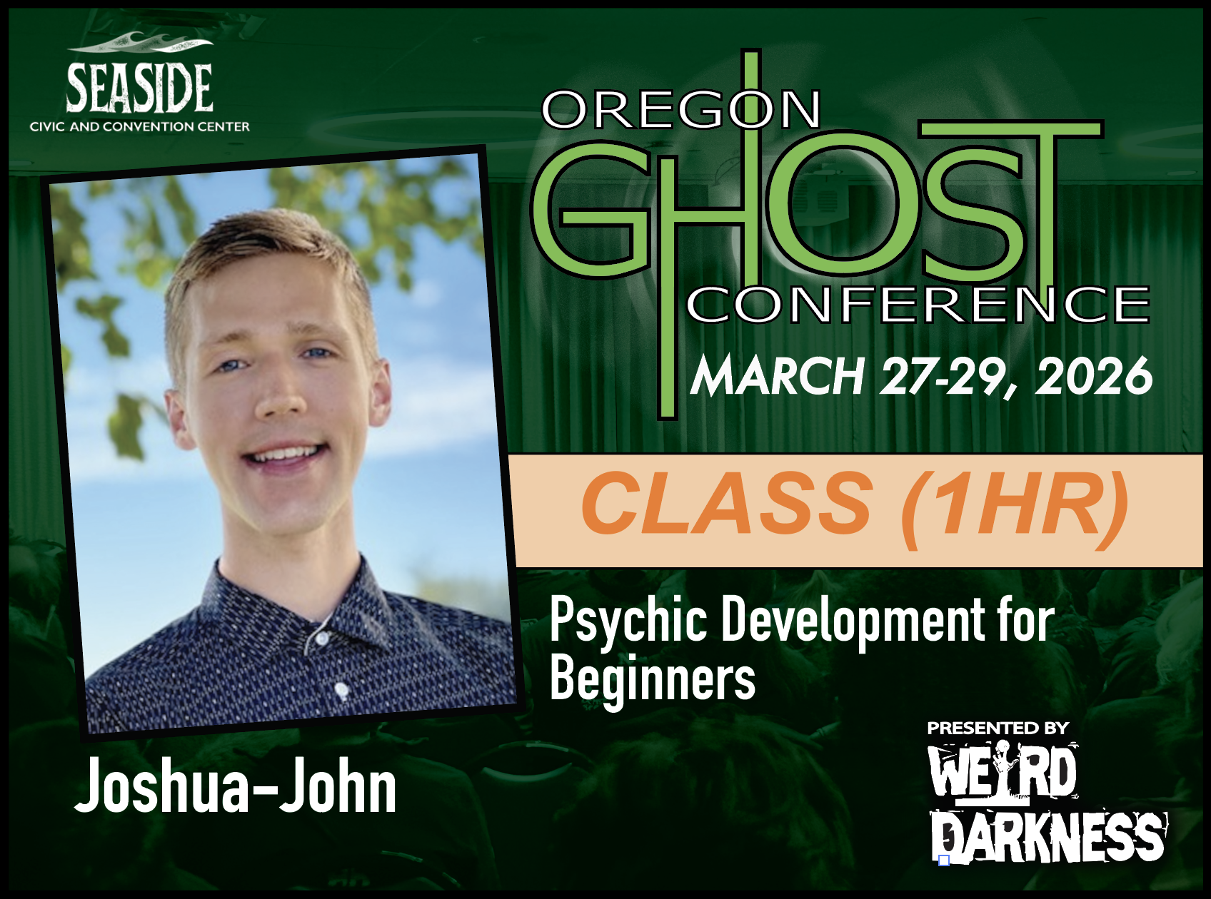General Admission Tickets are $20 and are good for the entire weekend. General Admission Tickets can be purchased through our Online Box Office or at the Oregon Ghost Conference Box Office at the Seaside Civic and Convention Center: Friday, March 27th-Sunday, March 29th.