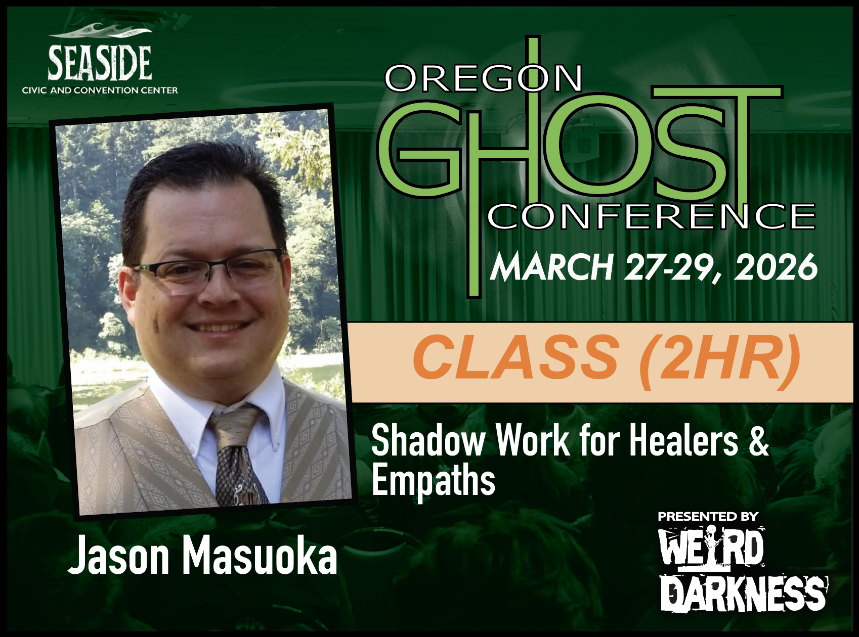| | | | | | | | Shadow Work for Healers and Empaths Taught by returning instructor Jason Masuoka, this transformative class explores the archetype of the wounded warrior—those who feel called to heal others because of their own deep wounds. While this path can be powerful and sacred, it often leads to burnout, blurred boundaries, and energetic depletion. In this session, Jason guides empaths, intuitives, and healing practitioners through the essential inner work of recognizing and integrating their own shadows. Participants will learn how to identify when their giving becomes self-sacrifice, how to set clear energetic boundaries, and how to care for themselves without guilt or spiritual bypassing. Through practical tools, metaphysical insight, and compassionate dialogue, Jason helps attendees reclaim their sovereignty and redefine what it means to serve from a place of wholeness rather than wounding. This class is ideal for anyone who feels overwhelmed by the weight of others’ emotions, or who struggles to balance their healing gifts with personal well-being. Come ready to reflect, release, and realign. Your healing journey deserves just as much care as the ones you support. | | | | | | | | Class Outcomes: | | | | | | | | By the end of this class, attendees will learn: How to recognize the wounded warrior archetype within themselves and its impact on their healing work Techniques for setting and maintaining healthy energetic boundaries Practices for self-care that honor their sensitivity without guilt or overextension Tools for identifying when helping becomes self-sacrifice—and how to shift that pattern How to engage with their own shadow work to foster clarity, resilience, and authenticity Language and strategies for communicating boundaries in personal and professional settings | | | | | | | | Instructor Biography Page | | | | | | | | | | | | | | | | | | | | | | | | | | OGC Ticketing Tips: | | | | | | Before purchasing tickets for Classes, Evening Events, Investigtions or Ghost Tours, we highly recommend that you make a plan by looking at the 2026 Schedule so you can decide how you want to spend your time and to make sure you don’t purchase tickets for classes or events that overlap or cause scheduling conflicts. Please plan carefully because there are NO CASH REFUNDS. Individual tickets for classes, tours, investigations and events are available from each class or event page and can also be found through the 2026 Schedule or the Online Box Office. In addition to purchasing individual tickets to classes, tours or events, you will also need to purchase a General Admission Ticket. General Admission Tickets are $20 and are good for the entire weekend. General Admission Tickets can be purchased through our Online Box Office or at the Oregon Ghost Conference Box Office at the Seaside Civic and Convention Center: Friday, March 27th-Sunday, March 29th. General Admission tickets are good for admission to the Vendors Area and all Main Stage Speaker presentations for all three days of the Oregon Ghost Conference. Sunday Only General Admission Tickets are $10 and can only be purchased in person at the Oregon Ghost Conference Box Office at the Seaside Civic and Convention Center, Sunday, March 29th ONLY. | | | | | | | | | Shadow Work for Healers and Empaths | | | 2hr Class Registration: $25.00 | | | | | | | | | | | | | | | | |