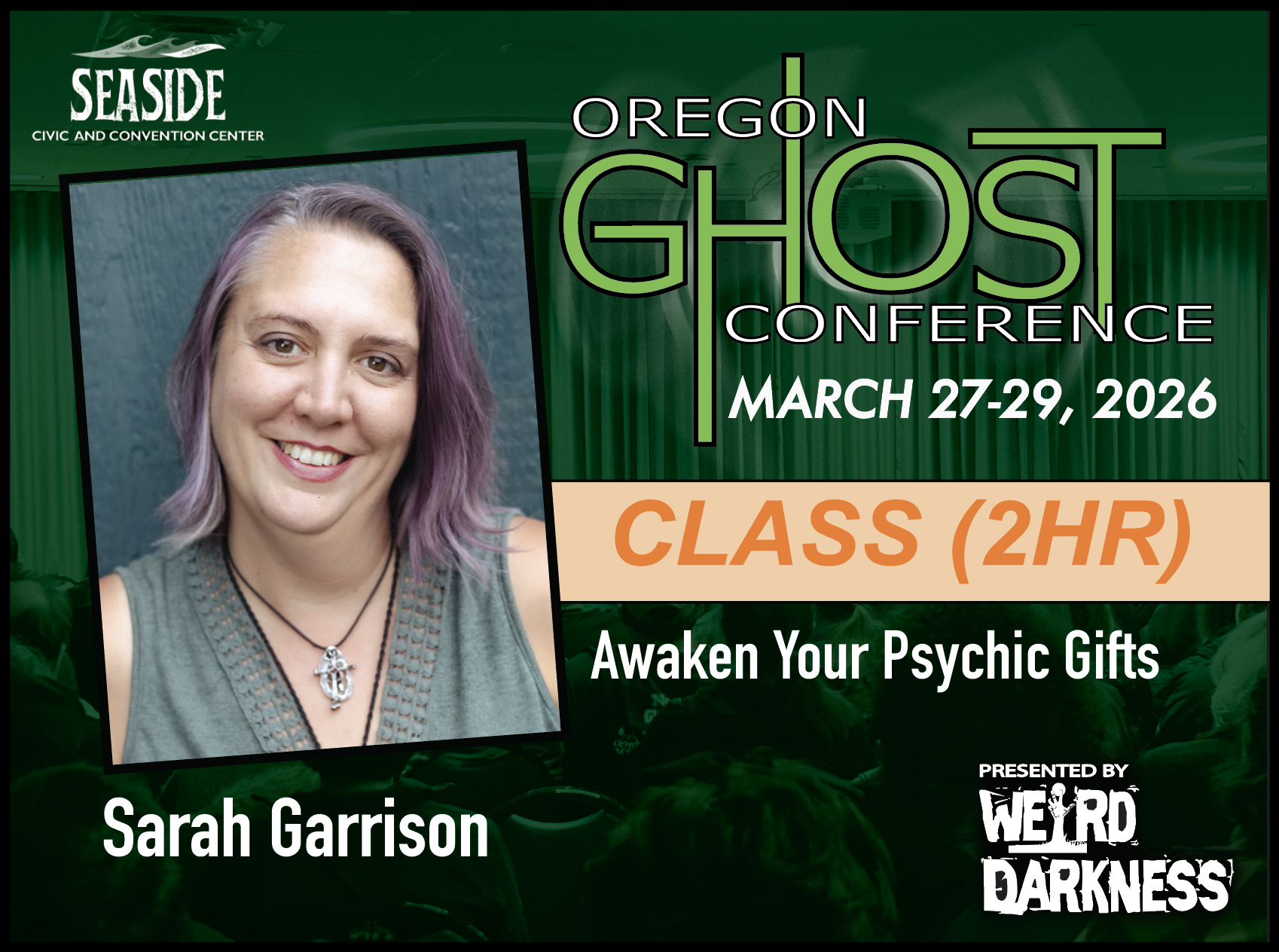 | | | | | | | | You don’t have to be a professional medium to connect with the spirit world—you just need to understand how you receive messages. In this immersive two-hour class, Sarah Sunshine Garrison will guide you through the process of identifying, clearing, and activating your next-level psychic gifts. You’ll learn about the 7 Planes of Existence and the basics of ThetaHealing®, a spiritual modality that helps uncover blocks and connect directly with Divine Source. You’ll choose a specific gift—like clairvoyance, clairsentience, energy healing, or spirit communication—that you feel ready to awaken. Then, through a guided activation meditation, you’ll energetically open to receive it. Whether you’re just starting to explore your psychic abilities or you’re ready to go deeper, this class offers a grounded, powerful space to activate what’s already within you. We’ll close with discussion and, if time allows, practice in pairs or small groups. | | | | | | | | Class Outcomes: | | | | | | | | By the end of this class, attendees will have identified a specific psychic gift they are ready to activate and will have experienced a guided energetic process to support that awakening. They will leave with a deeper understanding of how they uniquely receive intuitive information, along with greater confidence in their ability to sense, interpret, and trust the guidance they receive. This session will also provide a safe and supportive space for exploring their abilities and connecting with others on a similar path. | | | | | | | | Instructor Biography Page | | | | | | | | | | | | | | | | | | | | | | | | | | OGC Ticketing Tips: | | | | | | Before purchasing tickets for Classes, Evening Events, Investigtions or Ghost Tours, we highly recommend that you make a plan by looking at the 2026 Schedule so you can decide how you want to spend your time and to make sure you don’t purchase tickets for classes or events that overlap or cause scheduling conflicts. Please plan carefully because there are NO CASH REFUNDS. Individual tickets for classes, tours, investigations and events are available from each class or event page and can also be found through the 2026 Schedule or the Online Box Office. In addition to purchasing individual tickets to classes, tours or events, you will also need to purchase a General Admission Ticket. General Admission Tickets are $20 and are good for the entire weekend. General Admission Tickets can be purchased through our Online Box Office or at the Oregon Ghost Conference Box Office at the Seaside Civic and Convention Center: Friday, March 27th-Sunday, March 29th. General Admission tickets are good for admission to the Vendors Area and all Main Stage Speaker presentations for all three days of the Oregon Ghost Conference. Sunday Only General Admission Tickets are $10 and can only be purchased in person at the Oregon Ghost Conference Box Office at the Seaside Civic and Convention Center, Sunday, March 29th ONLY. | | | | | | | | | Awaken Your Psychic Gifts | | | 2hr Class Registration: $25.00 | | | | | | | | | | | | | | | | |