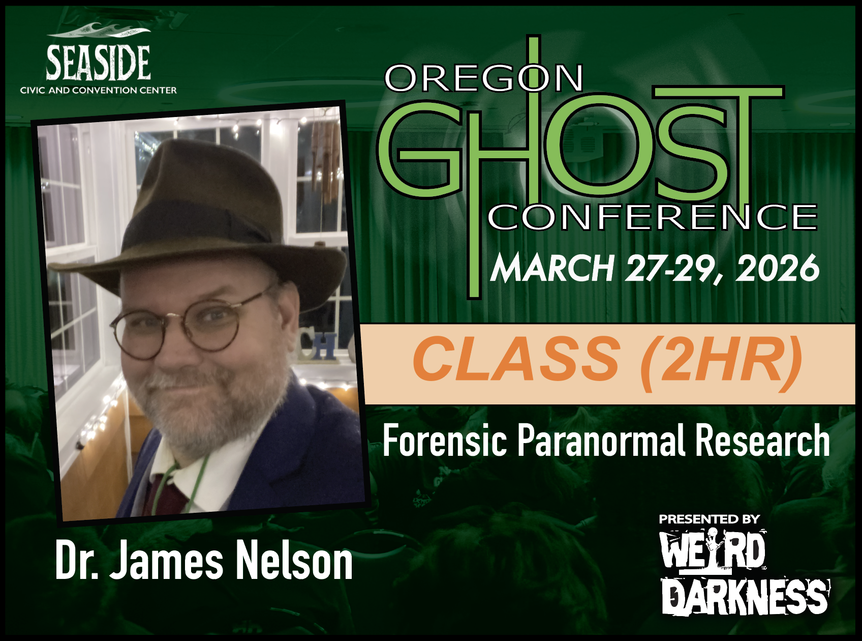 General Admission Tickets are $20 and are good for the entire weekend. General Admission Tickets can be purchased through our Online Box Office or at the Oregon Ghost Conference Box Office at the Seaside Civic and Convention Center: Friday, March 27th-Sunday, March 29th.