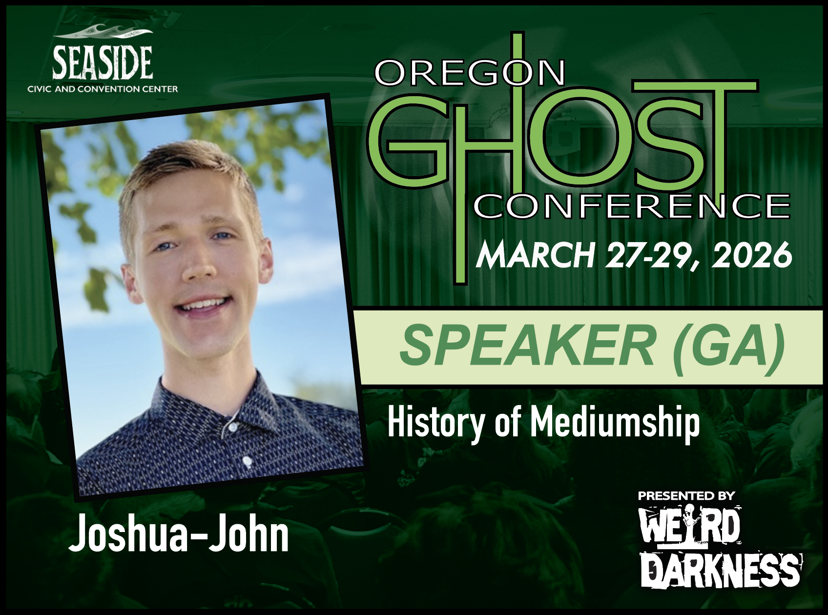 General Admission Tickets are $20 and are good for the entire weekend. General Admission Tickets can be purchased through our Online Box Office or at the Oregon Ghost Conference Box Office at the Seaside Civic and Convention Center: Friday, March 27th-Sunday, March 29th.