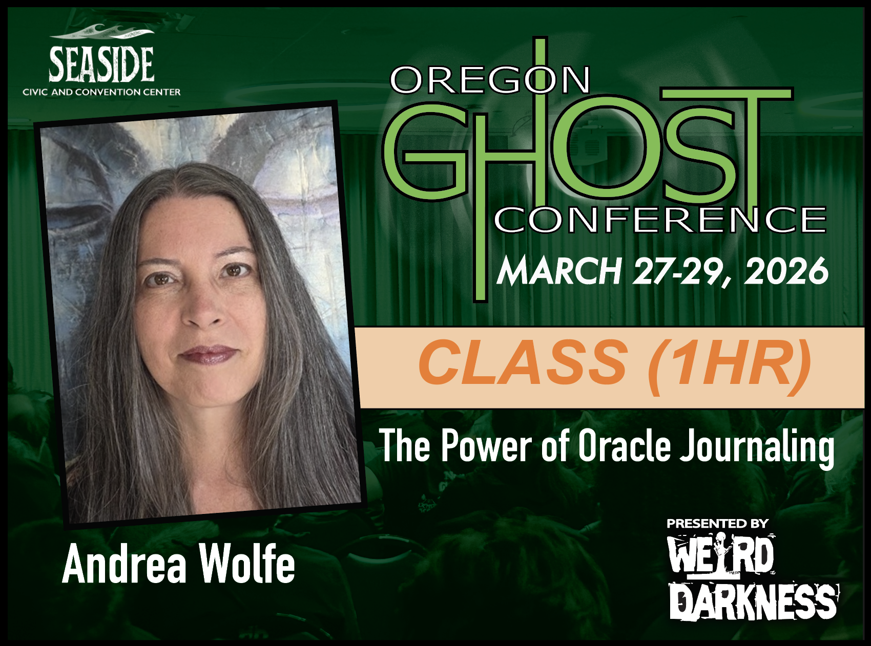 | | | | | | | | Join intuitive medium and healer Andrea Wolfe for a soul-nourishing class that introduces the transformational practice of oracle journaling. Based on her new workbook, My Oracle Journaling: Journey to Enlightenment, Clarity & Connection, this class invites you to step onto a sacred path of self-discovery, spiritual guidance, and inner healing. Through the lens of the Unalome—the symbol of the soul’s journey—you’ll learn how journaling with oracle cards can help you release confusion, embrace clarity, and strengthen your connection to Spirit. Andrea will guide you through the stages of the journey: beginning in curiosity, moving through life’s twists and turns, and arriving in a place of peace and deeper awareness. During this session, you’ll experience a hands-on journaling practice, guided reflection, and an opportunity to listen for the wisdom your soul is ready to share. Whether you’re new to oracle cards or already love journaling, this class offers a simple yet profound way to weave Spirit into your daily life. You’ll leave with tools for continuing your 30-day journey at home, along with inspiration to carry your own voice of truth forward. You will have the opportunity to purchase your very own copy of My Oracle Journaling: A Journey to Enlightenment, Clarity & Connection autographed and ready to change your spiritual journey. | | | | | | | | Class Outcomes: | | | | | | | | From this class you will take home a personal experience with oracle journaling and how it can bring clarity, connection, and insight. A sense of connection—to yourself, Spirit, and your inner wisdom. And I will show you where to purchase your copy of My Oracle Journaling: A Journey to Enlightenment, Clarity & Connection | | | | | | | | Instructor Biography Page | | | | | | | | | | | | | | | | | | | | | | OGC Ticketing Tips: | | | | | | Before purchasing tickets for Classes, Evening Events, Investigtions or Ghost Tours, we highly recommend that you make a plan by looking at the 2026 Schedule so you can decide how you want to spend your time and to make sure you don’t purchase tickets for classes or events that overlap or cause scheduling conflicts. Please plan carefully because there are NO CASH REFUNDS. Individual tickets for classes, tours, investigations and events are available from each class or event page and can also be found through the 2026 Schedule or the Online Box Office. In addition to purchasing individual tickets to classes, tours or events, you will also need to purchase a General Admission Ticket. General Admission Tickets are $20 and are good for the entire weekend. General Admission Tickets can be purchased through our Online Box Office or at the Oregon Ghost Conference Box Office at the Seaside Civic and Convention Center: Friday, March 27th-Sunday, March 29th. General Admission tickets are good for admission to the Vendors Area and all Main Stage Speaker presentations for all three days of the Oregon Ghost Conference. Sunday Only General Admission Tickets are $10 and can only be purchased in person at the Oregon Ghost Conference Box Office at the Seaside Civic and Convention Center, Sunday, March 29th ONLY. | | | | | | | | | The Power Of Oracle Journaling | | | 1hr Class Registration: $15.00 | | | | | | | | | | | | | | | | |